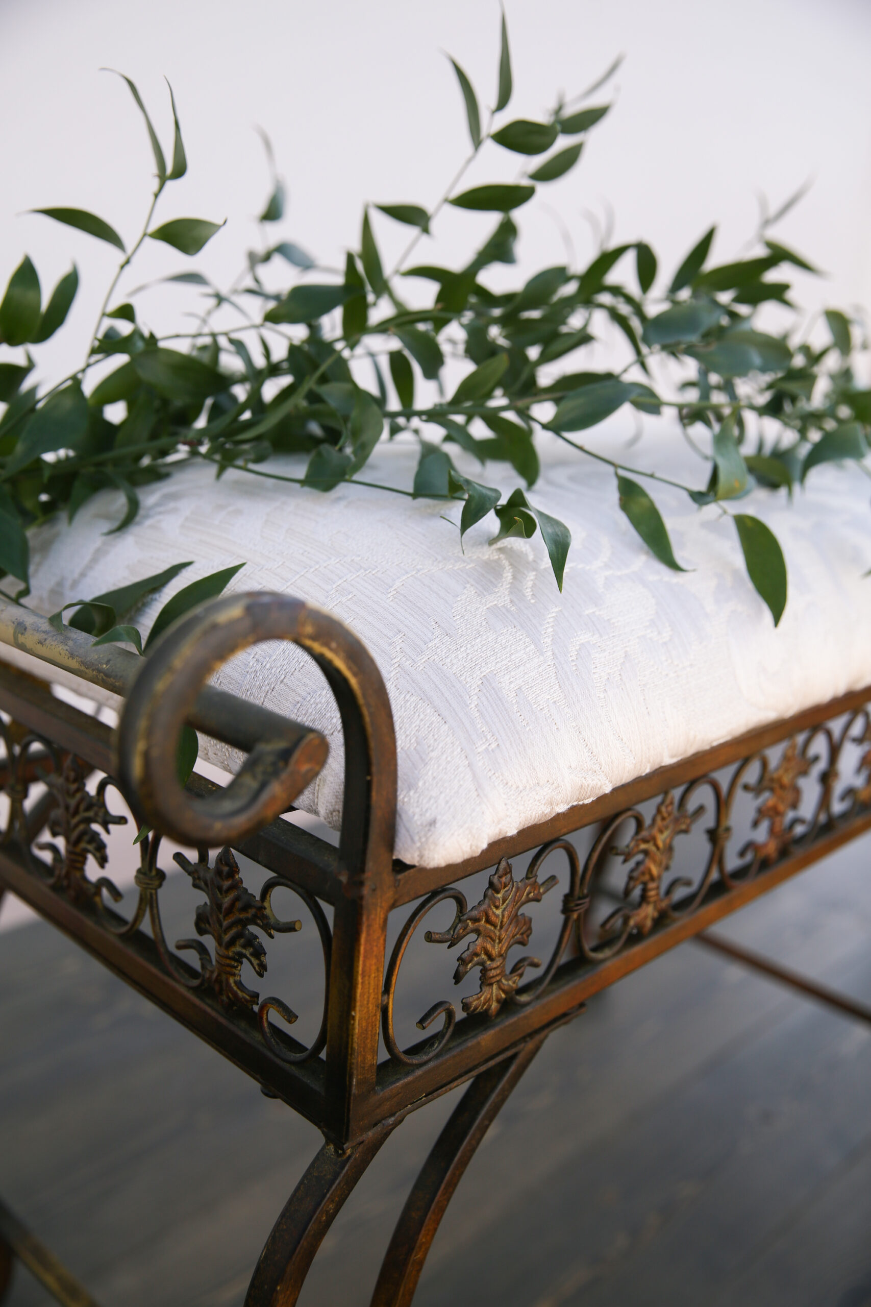 Description: curved vintage metal bench seat with white tapestry