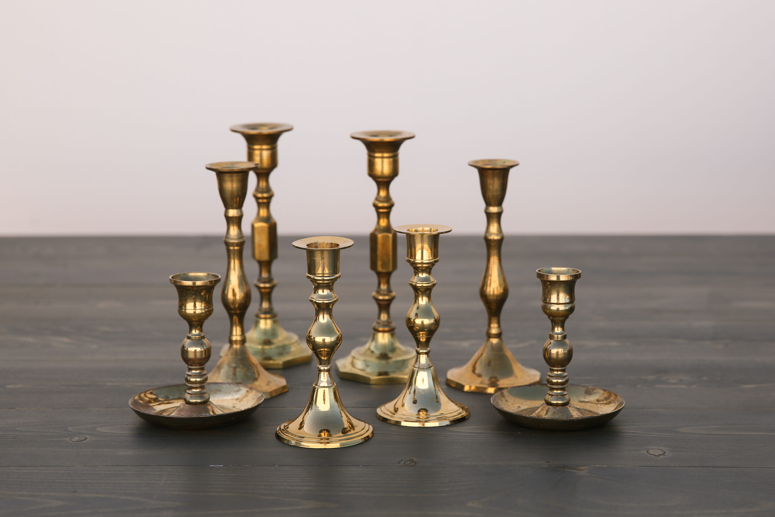 Description: various sets of brass candle sticks